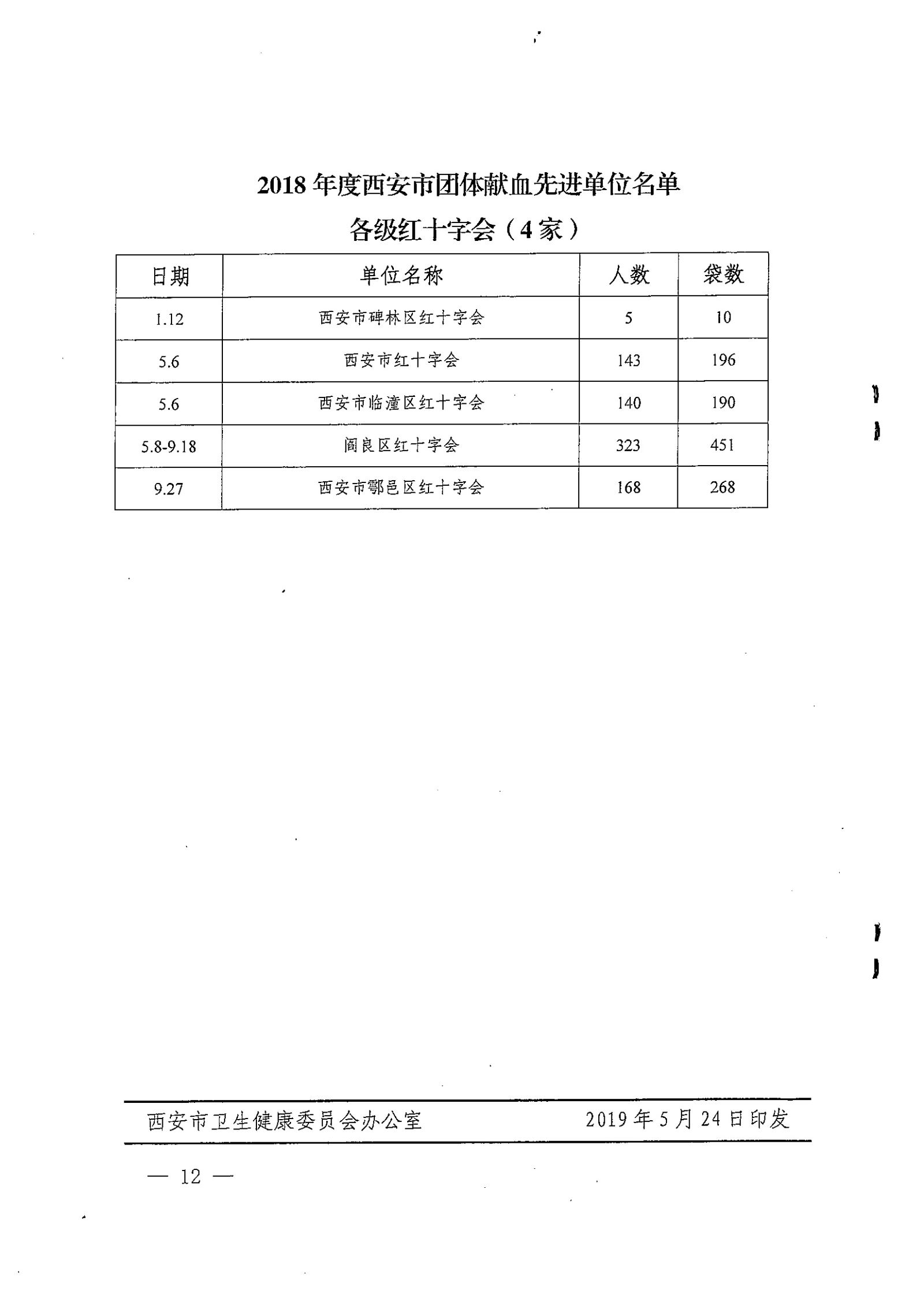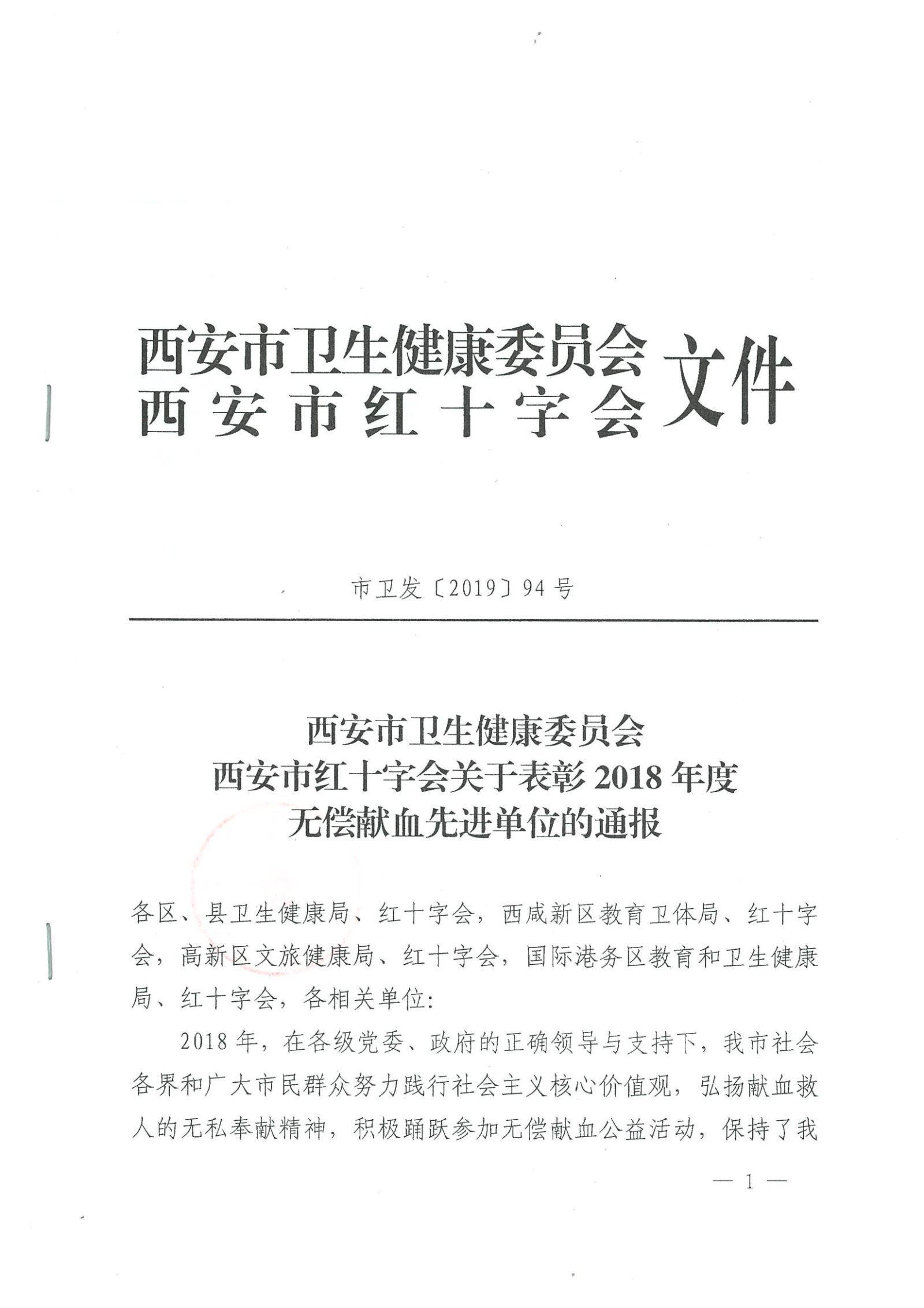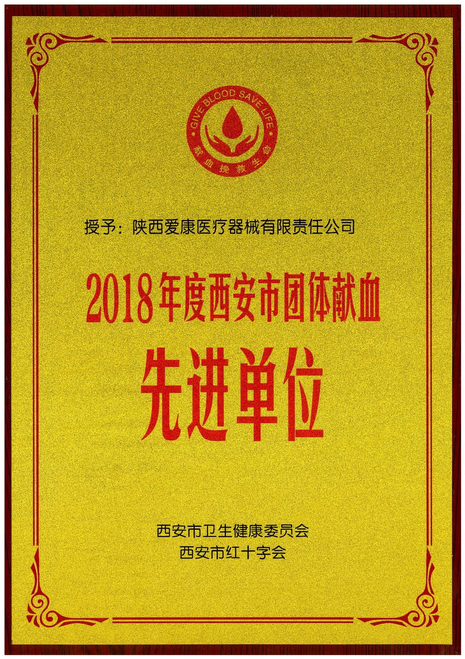 西安市衛(wèi)生健康委員會(huì)、西安市紅十字會(huì)于2019年5月24日發(fā)表紅頭文件表彰2018年度無償獻(xiàn)血先進(jìn)單位。陜西愛康醫(yī)療器械有限責(zé)任公司2018年4月組織公司全體員工在西安市中心血站進(jìn)行無償獻(xiàn)血,被評為2018年度西安市團(tuán)體獻(xiàn)血先進(jìn)單位。