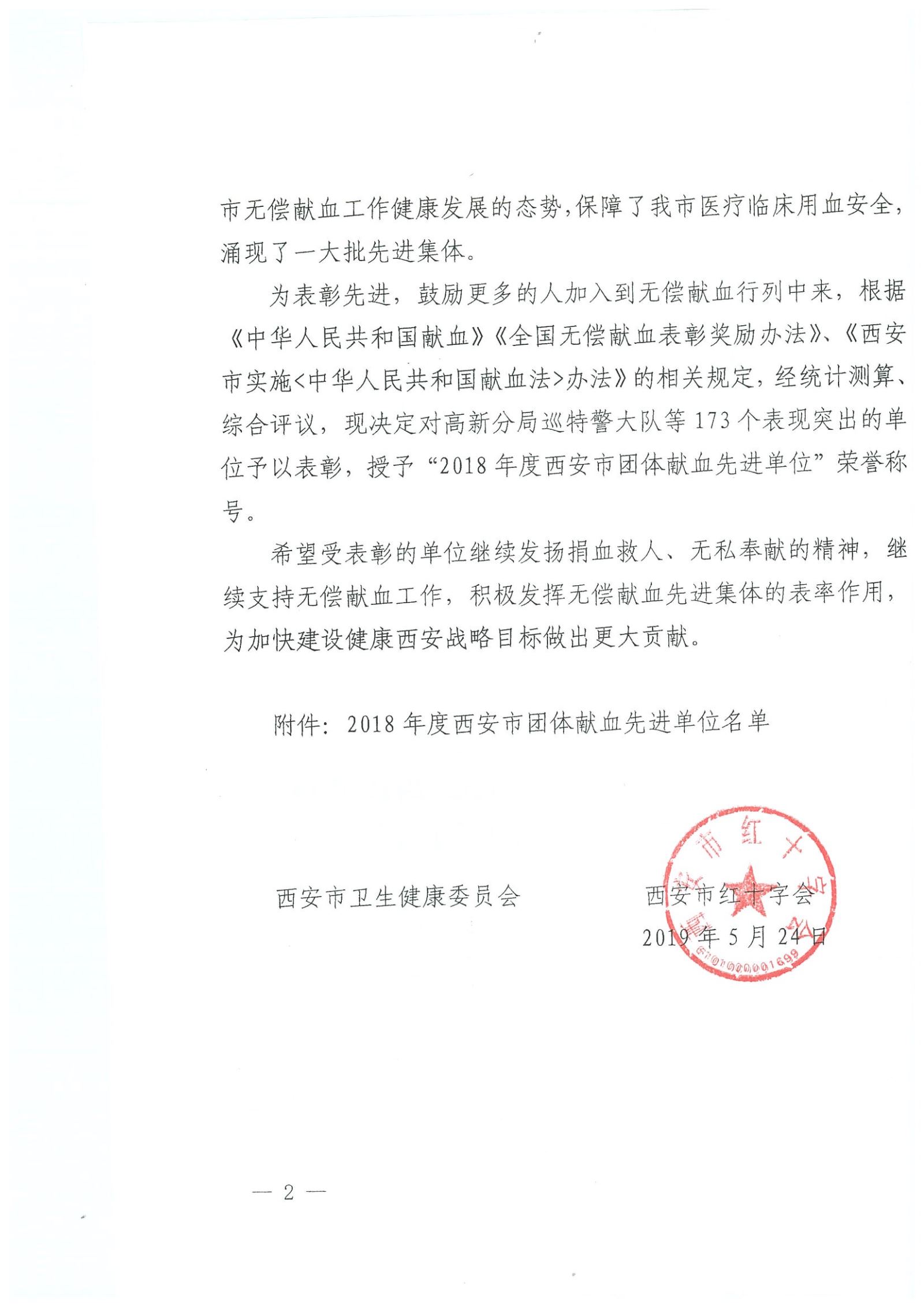 獲2018年度西安市團(tuán)體獻(xiàn)血先進(jìn)單位